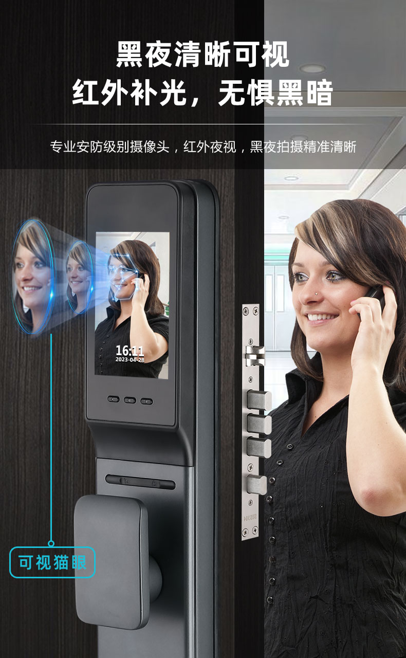在這個五一假期,讓(ràng)我們來談談如何通過高科技提升家居安全。我們的智(zhì)能鎖配備了4.0寸100萬像素的高清可視貓眼,采(cǎi)用150度的大廣角鏡頭,確保門(mén)外的每一個角落都無死角地被捕捉。無(wú)論(lùn)是白天還是夜晚,雙紅外補光技術都能提供清晰的圖像,讓(ràng)您即使在視線不佳(jiā)的情況下也能清楚地看到門外的一切。
