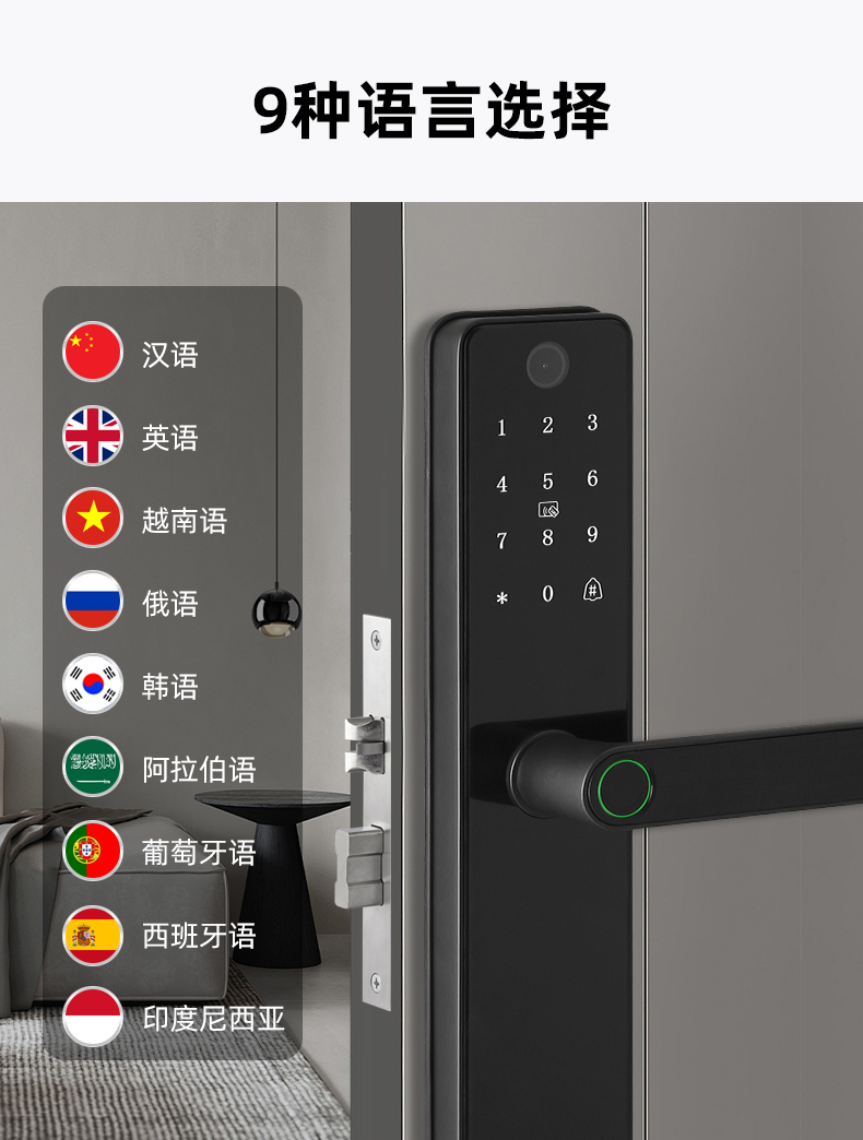 IP53防塵防水,一握即開,適應複雜戶外環境;異常開鎖報警功能,遇暴力撬(qiào)鎖、密碼多次錯誤輸入,立即觸發防撬開關,發出警報聲震(zhèn)懾不法分子;9種語言支持(漢語、英語、越(yuè)南語、俄語、韓語、阿拉伯語、葡萄牙語、西班牙語、印度尼西亞語)適配多元居住場(chǎng)景,國際範與安全感拉滿。
