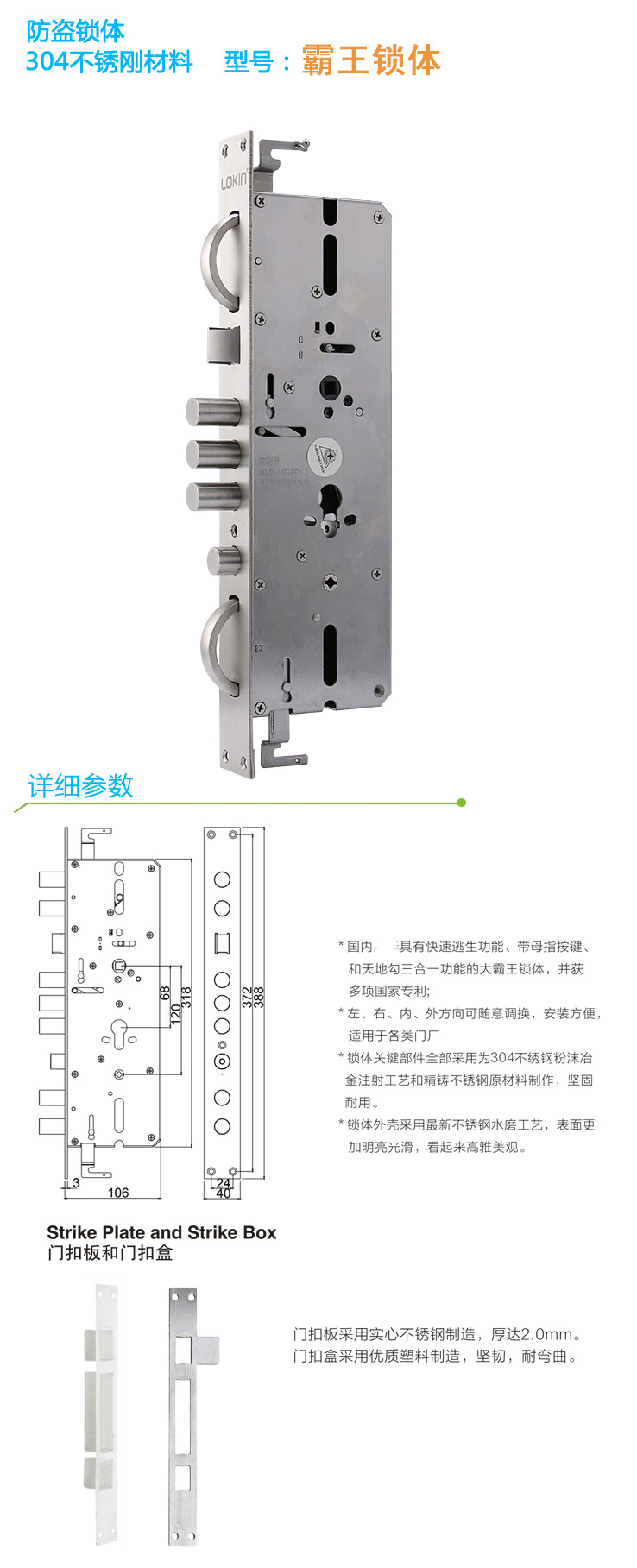 * 具有快速逃生功能、帶拇指按鍵和天地勾 三(sān)合一功能的大霸王 鎖體,並獲多項國家(jiā)專利(lì)。