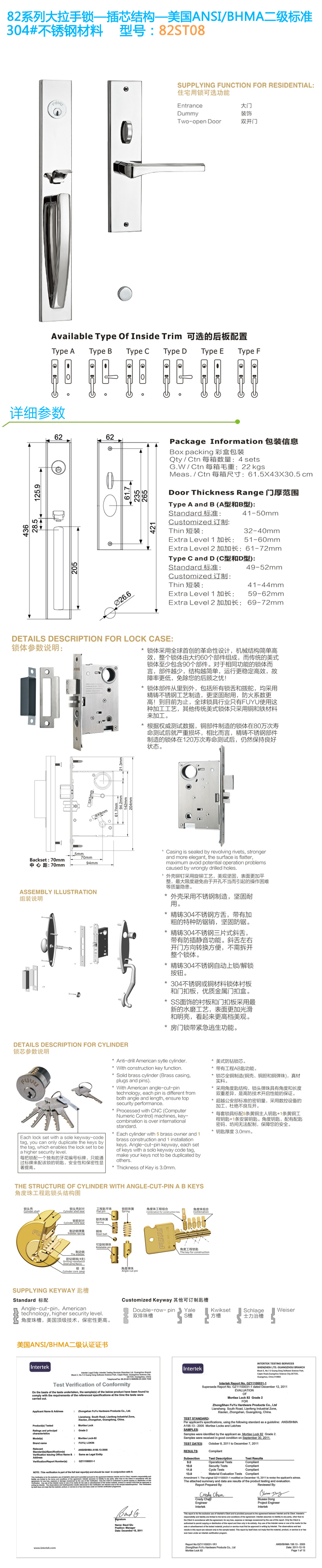 * 鎖體采用精鑄不鏽鋼斜(xié)舌、防鋸(jù)方舌、轉子和拔舵