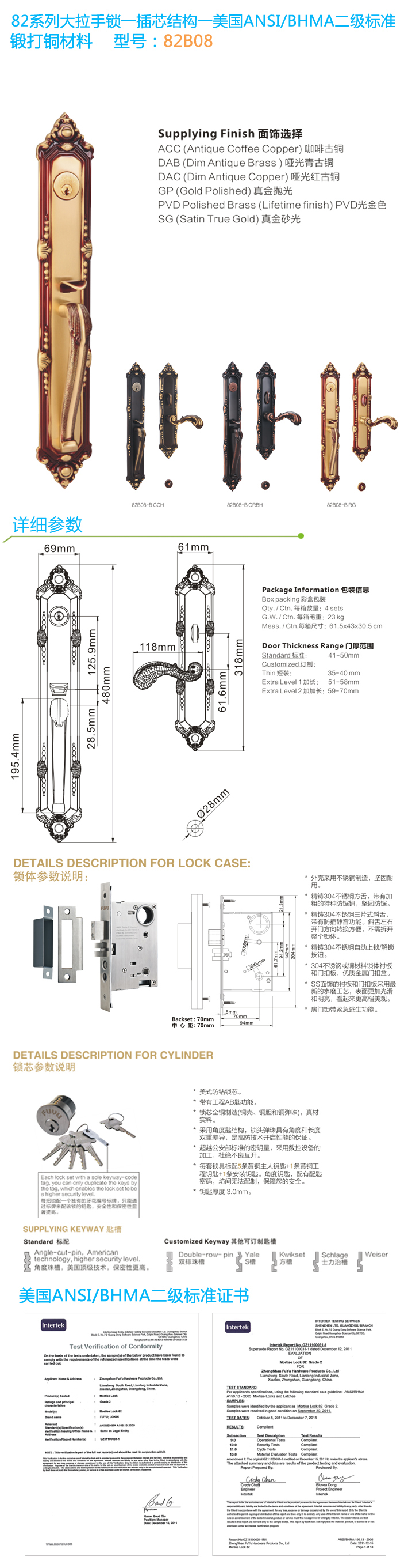 * 通過美國(guó)ANSI/BHMA GRADE二級(jí)認(rèn)證